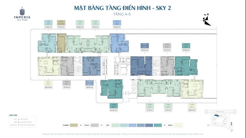 Bảng giá căn hộ Imperia Sky Park được xây dựng theo từng loại hình và diện tích, phản ánh rõ phân khúc cao cấp của dự án tại Nam An Khánh. Các căn studio có tổng giá thấp nhất, phù hợp với khách hàng đầu tư hoặc người mua ở một mình. Nhóm căn 1 phòng ngủ và 1 phòng ngủ + 1 có mức giá trung bình, hướng tới người trẻ và gia đình nhỏ muốn sở hữu căn hộ hiện đại với chi phí hợp lý.